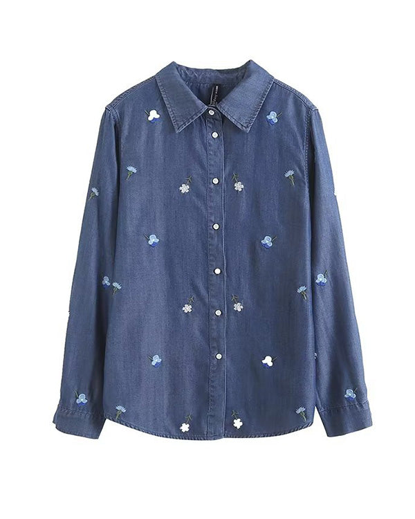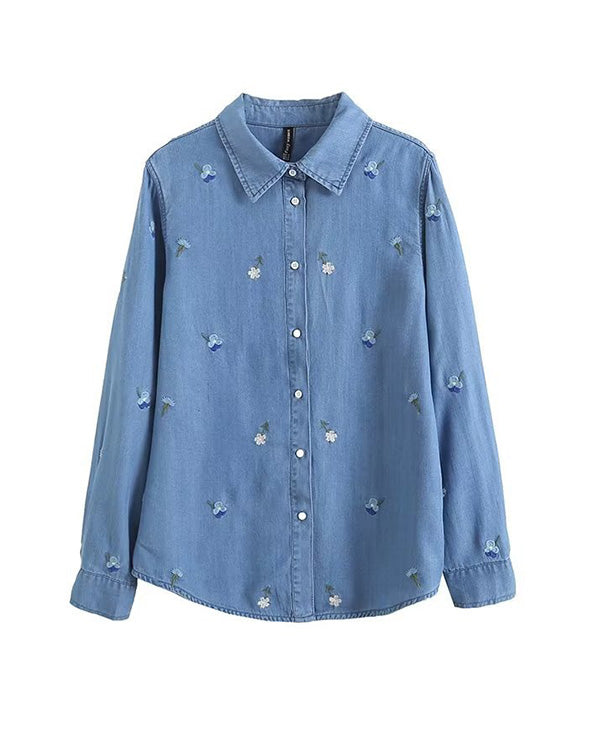 Clidress Embroidered Flower Denim Shirt
