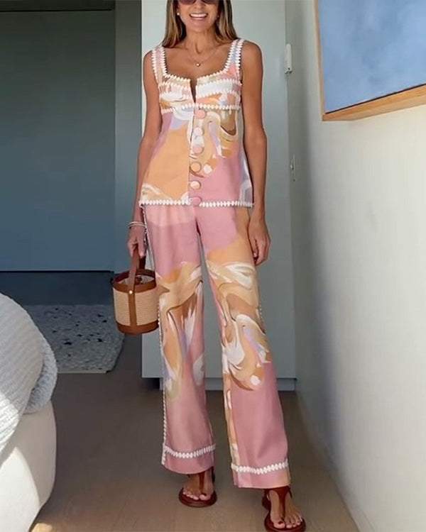 Details Style: Casual Pattern Type: Printed Top Type: Strapless Tank Top Neckline: U Neck Sleeve Length: Sleeveless Bottom Type: Wide leg Pants Length: Long Pants & Tops Material: Cotton Fit Type: Regular fit SIZE US/CAN BUST TOP LENGTH WAIST BOTTOM ...
