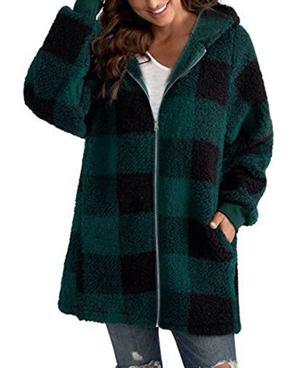 Clidress Hooded Plaid Zipper Roomy Fit Coat