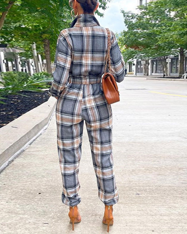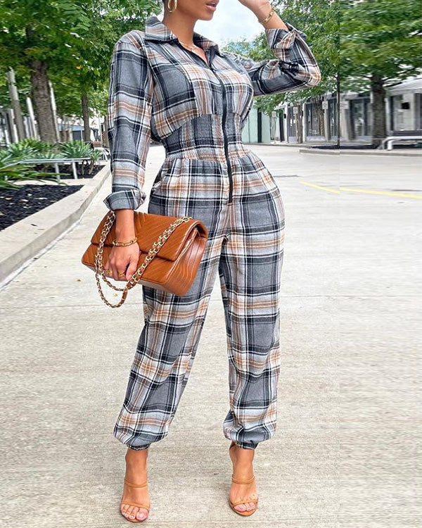 Product Description material Cotton Blend pattern Plaid style Chic neckline Turn-down Collar sleeveLength Long Sleeve decoration Shirred,Zipper clothLength Long packageInclude 1*Jumpsuit occasion Daily season Fall,Spring fitType Regular type Jumpsuit Size Chart inch / cm S M L XL bust...