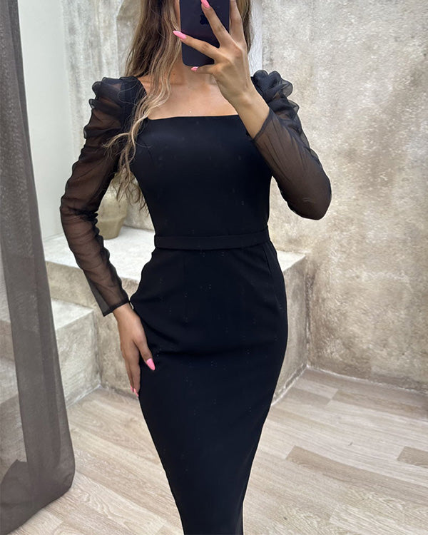 Description Color:Black Style:Elegant Pattern Type:Plain Details:Sheer, Mesh Neckline:U Neck Type:Fitted Sleeve Length:Long Sleeve Waist Line:Natural Hem Shaped:Pencil Length:Maxi Fit Type:Regular Fit Fabric:High Stretch Material:Knitted Fabric Composition:67% Polyester, 30% Viscose, 3% Elastane Care Instructions:Machine wash or professional dry clean Size US Bicep...