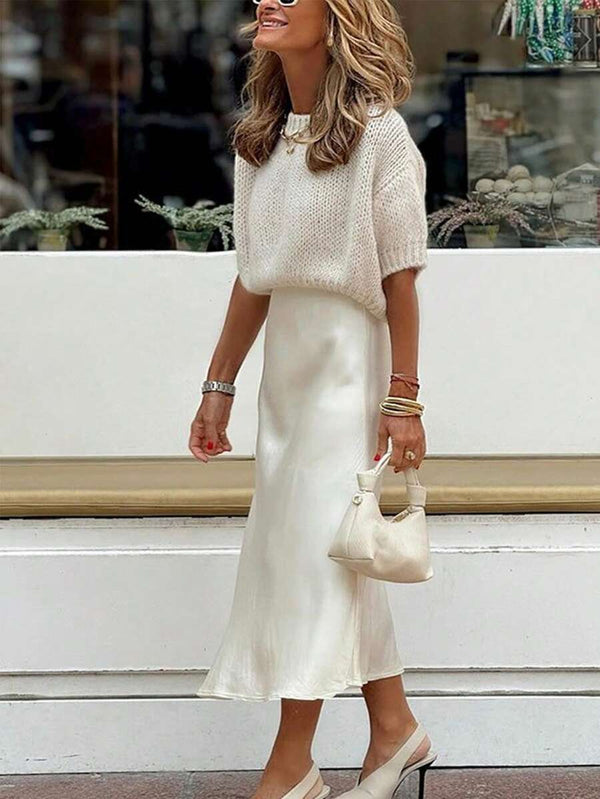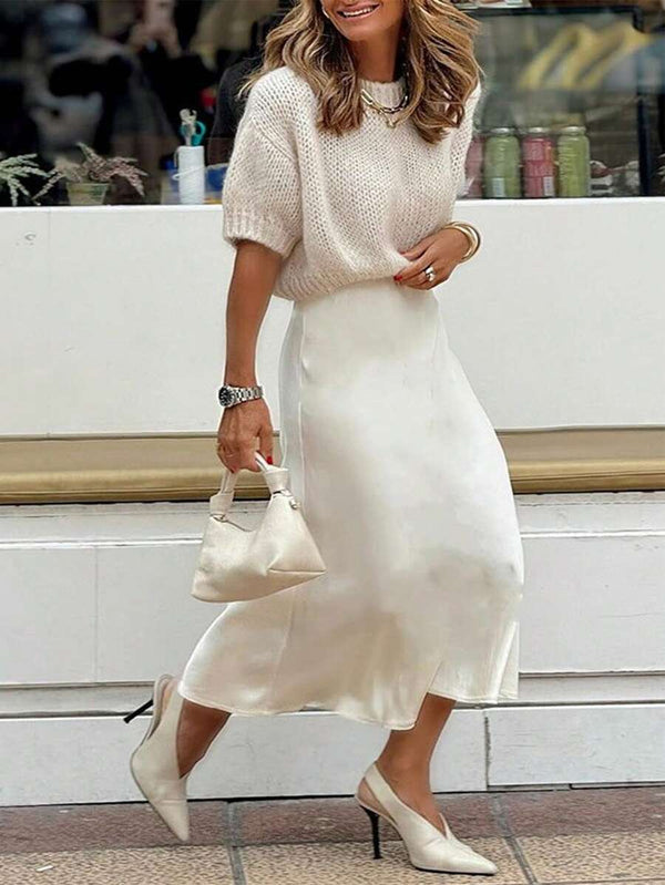 Details Style: Elegant Pattern Type: Plain Tops Length:  Crop Neckline:O Neck Tops Sleeve Length:Short  Sleeve Skirts Length: Long Tops & Pants Material: Knitting