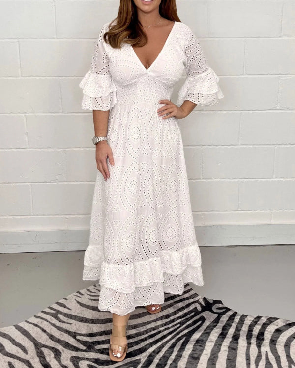 Details Pattern Type: Plain Design Details: Eyelet Embroidery Neckline: V neck Type: A Line Sleeve Length: 3/4 Sleeve Sleeve Type: Flutter-Sleeve Waist Line: High Waist Hem Shaped: Flounce Length: Maxi Fit Type: Regular Fit Material: Fabric SIZE US/CAN LENGTH SLEEVE...