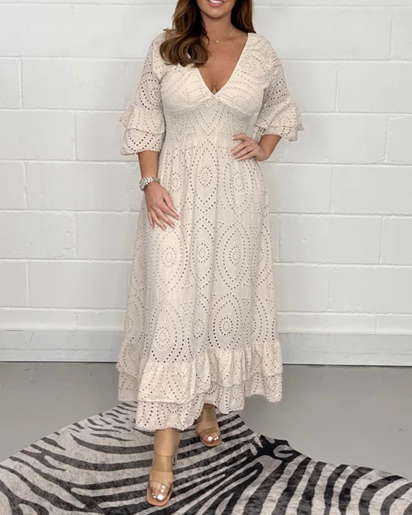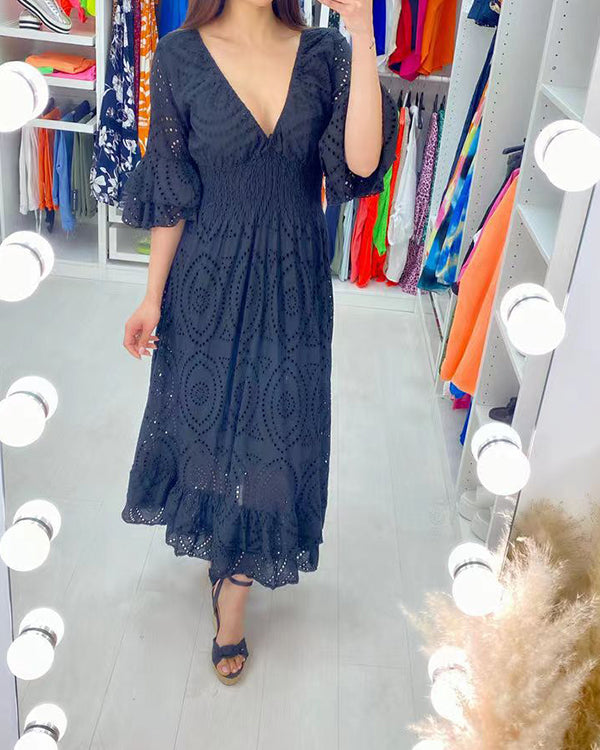 Clidress V Neck Cotton Hollow Out Maxi Dress